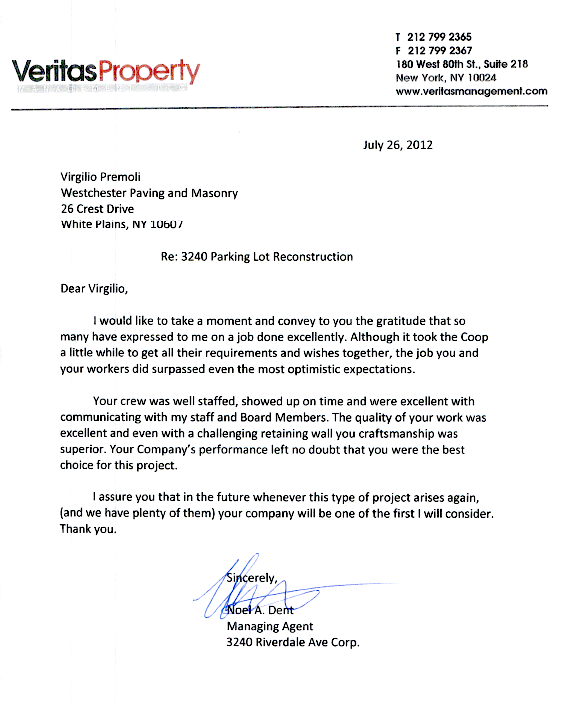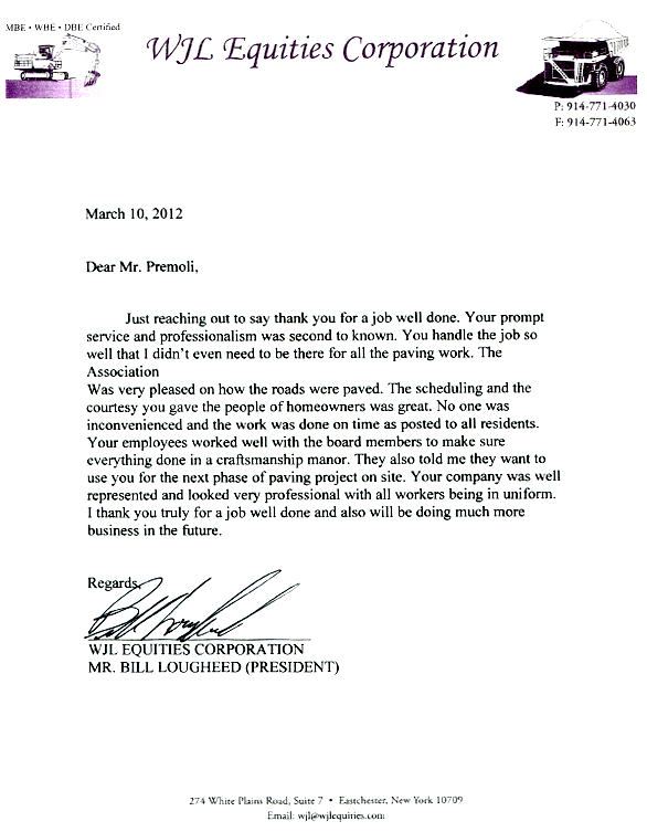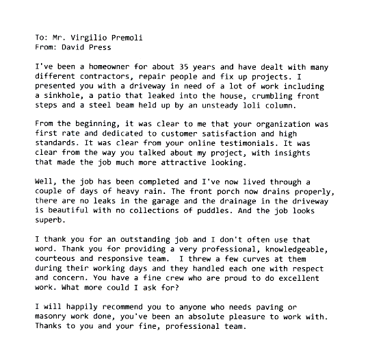 Thank you so much for an outstanding job by your team of workers in providing us with a new garage floor, a new driveway, and Belgium block masonry work. We heartily recommend Westchester Paving and Masonry Corp. for a residential paving job. All services, from the initial phone contact to the completion of the work, were handled promptly, courteously, carefully and respectfully. The scope of the job which included a new garage floor, a new asphalt driveway and Belgium block masonry work was efficiently completed in three work days. The president/manager was overseeing the job regularly. the team of friendly workers worked hard and diligently. Every step of the job was orchestrated in a very organized fashion. the team even went out of their way to carefully work around several established garden plants that were precariously in their way. They simply performed an outstanding job.